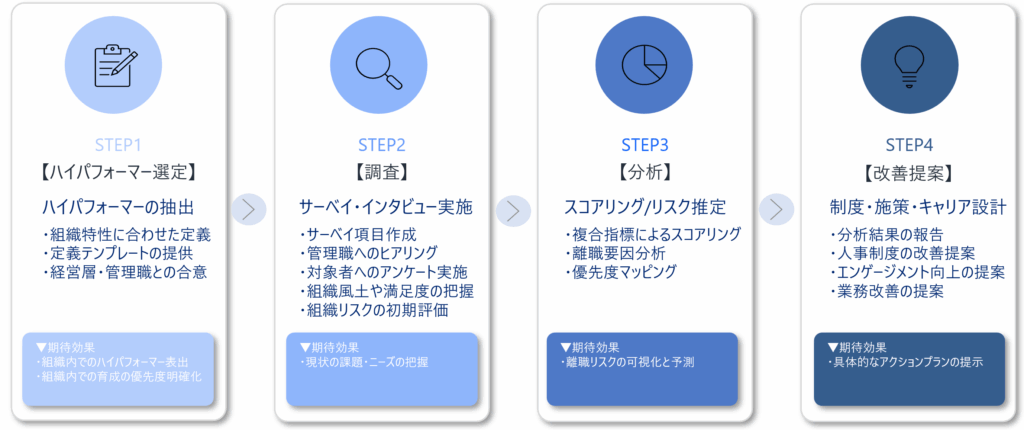 「離職防止サーベイ」はハイパフォーマーの特性を分析し、離職要因を深掘りすることで、組織改革と従業員エンゲージメント向上を支援するサービスです。4つのプロセスに分けて、ハイパフォーマーを中心とした離職サーベイを実施。